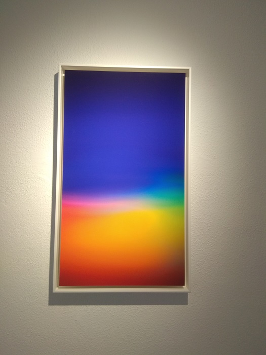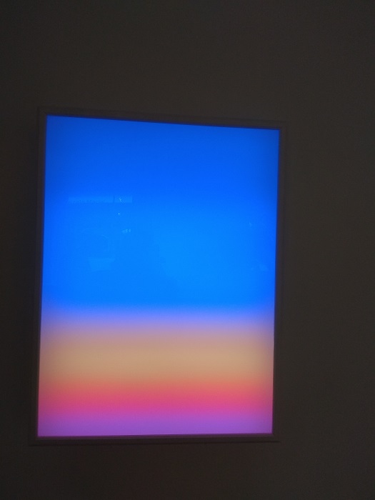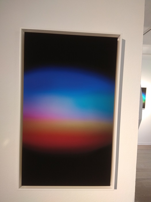 In total ten pieces created mostly last year are exhibited, although there are also some from 2017 and 2019. All of them are made through a sequence of lights in loop, backlight, LEDs, RGB, acrylic and wood, or, in printing of pigmented inks on Hahnemühle paper. In them it is appreciated how the artist alternates different chromatic possibilities to form the horizons through the appearance of different gradations that go from violet to blue, passing through yellow. It is not about visualizing a horizon, but several horizons. It is as if in a landscape, in this case a marina, appears in the foreground the sand, then the sea, the horizon line and the sky, although the separation of these elements is defined by the painter himself. Somehow, this distribution of color in space recalls the compositions of Mark Rothko, with its huge rectangular color fields where a kind of horizons emerge, which are the limits where the change of color occurs.