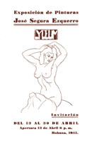 The name of Segura Ezquerro faded away in the memory of the Cuban art until 1988 when curators Ramon Vazquez Diaz and Jose Antonio Navarrete, of the National Museum of Fine Arts, organized the anthological exhibition entitled Avant-gardism: The Emergence of Modern Art in Cuba and in which, among the artists we all wanted to see, the name of Jose Segura Ezquerro popped up. Many discovered an artist; others just remembered then a painter and a drawer who never deserved to be forgotten.