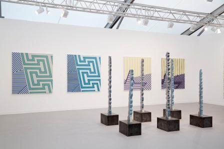 Among the bolder decisions is Almine Rech´s move to devote the gallery’s booth to paintings from two series by the emerging Chinese artist Xu Qu. Appropriating the watermarks of various paper currencies across the world, his “Currency Wars” paintings suggest a colorful critique of the commercialization of contemporary art within an increasingly globalized economy. Meanwhile, the gleaming, labyrinthine complexity of Xu’s “Maze” paintings (a continuation of the “Currency Wars” series) combines with curiously totemic sculptures to summon the polished inscrutability of digital culture and the abstract nature of commercial transactions.