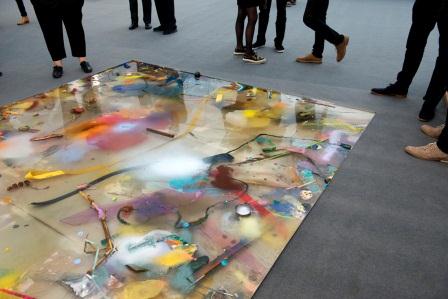 Farther out from the bustling center of the fair are some unexpected delights, chief among them Rachel Rose’s extraordinary miniature recreation of Frieze, the contribution of artist Asad Raza to the Frieze Projects, and Samara Scott at Peckham’s The Sunday Painter— perhaps the strangest and most alluring installation at the fair, a shallow trough filled with water, on the curiously stiff epidermis of which float splashes of color, like scum. Beneath the surface is visible, as if fixed in amber, a bizarre concoction of discarded clothing, fabric softener, nail polish, bits of food, sand, rope, rice, noodles, tights, and wine. Sunk into the floor, Lonely Planet is alone in the booth, a puddle into which one might fall. In its miscellaneous composition and its prevailing sense of hysterical contingency is a neat metaphor for Frieze London 2015, brilliantly defined by its diversity of styles.