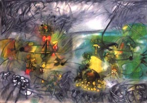 Recently appointed architect, Matta migrated to the art epicenters in Europe, where he was in touch with authors such as Walter Gropius and Moholy-Nagy, Marcel Duchamp, Salvador Dali and Andre Breton. During his 40 years of exile in New York, he was one of the artists who inspired the abstract expressionism. He’s considered a link between surrealism and young artists from the school in New York such as Robert Motherwell, Jackson Pollock, Arshile Gorky and William Baxiotes. The surrealist’s life and work can be defined in constant migration and experimentation. Matta made a multidimensional universe, with a repertory of paintings, engravings, sculptures and innovative experiences within the traditional languages and technological sphere. His images set connections with unfathomable spaces of unconsciousness, including fields such as science, philosophy, mythology from ancient American people, also considering the political contingency. In the 1950s, Matta lived in Rome and moved out to 1967 in Tarquinia, Italy, but he periodically travelled to Latin America and Chile. Myth of his origin or genius portent is the number coincidence in his birthday, 11-11-11, which he became a poetic element of his work.