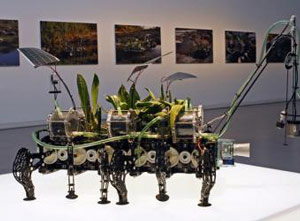 His works are forms of life, robotic sculptures that stay alive out of energy sources generated by the human race and that can be found in the urban environment. Several species of robotic parasites dwell inside the nave, complex restructuration and hybrids of technological wastes armed with mechanical and electronic systems that come together as artificial life with an ability to survive in this cityscape and invade the daily scenery.
