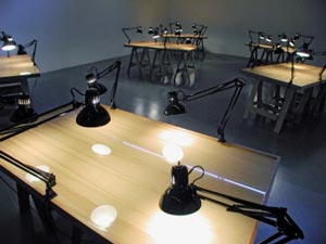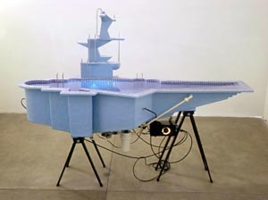 Artworks playing the leading role in the exhibition are Cama (2007); Portaviones (2005), in which this sign of belligerence and conflict transmutes miniature swimming pool; Frio Estudio del Desastre (2005), accurate reconstruction of a wall that’s been penetrated by a missile; and Espejos de Agua (2001), in which a series of ancient drawing tables, covered by water, are illuminated by desktop lamps. Likewise, the curatorship is looking forward to making reference to the drawing-sculpture (object) relation, by showcasing a series of large-scale watercolors that display “designs”, studies on objects. So, viewers will have the opportunity of appreciating the wide theme spectrum explored by both artists.