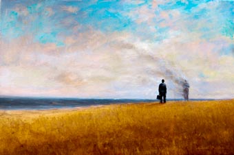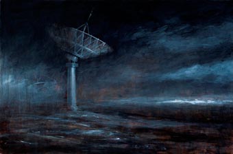 Landscapes usually entail the contrast of senses, given by the communion between an “almost surrealist” representation of nature and the presence of objects that seem to be out of context and put in the scene." Parabolic antennas, sophisticated ships, satellite instruments, ultramodern architecture, appear this time in front of desolated and lugubrious sceneries –covered by an apocalyptical impression–, objects that emerge just as if they were anticipated vestiges of a failed future. The subject gradually disappears as physical reference in the paintings and the symbolic weight of rationality in crisis gravitates over the selected artifacts.”