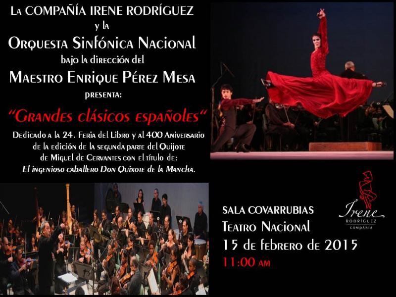 En el marco de la 24. Feria del Libro y dedicada al 400 Aniversario de la edición de la segunda parte del Quijote de Miguel de Cervantes con el título El ingenioso caballero Don Quixote de la Mancha, la Orquesta Sinfónica Nacional de Cuba bajo la dirección del Maestro Enrique Pérez Mesa y la Compañía Irene Rodríguez, ofrecerán una Gala titulada: “Grandes clásicos españoles” donde serán llevadas a la escena varias de las obras más afamadas de compositores españoles como Falla, Albéniz y Vives.