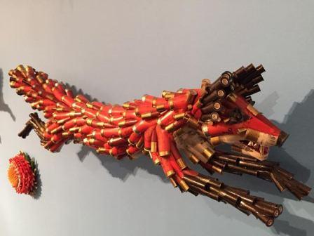 Ideó cuadros con árboles elaborados por balas de fúsil, de AK 47 y otro tipo de armamento. “Allí es donde deben terminar las balas, en arte…”, expresó uno de sus asesores, quien pidió omitir su nombre. Figuras de perros, conejos y hasta tortugas con cascos militares, hacen parte de la exposición admirada por colombianos y extranjeros.