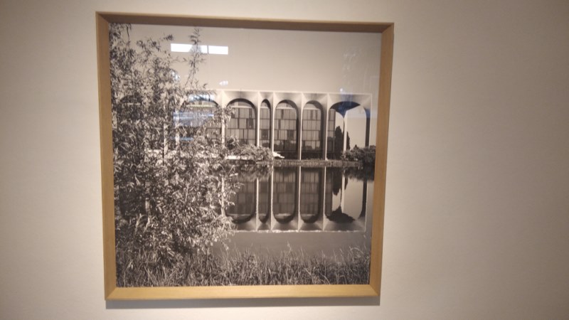 Respecto a Oscar Niemeyer, hay una fotografía del edificio Mondadori, donde se observan una serie de arcos alargados que parecen dobles, ya que la instantánea está tomada al otro lado de un pequeño lago artificial que se encuentra delante del edificio, lo que provoca que los arcos se reflejen en el agua. Además los arcos permiten la visibilidad del edificio que se halla detrás, como si fueran esculturas en las que el vacío es tan importante como el propio volumen.