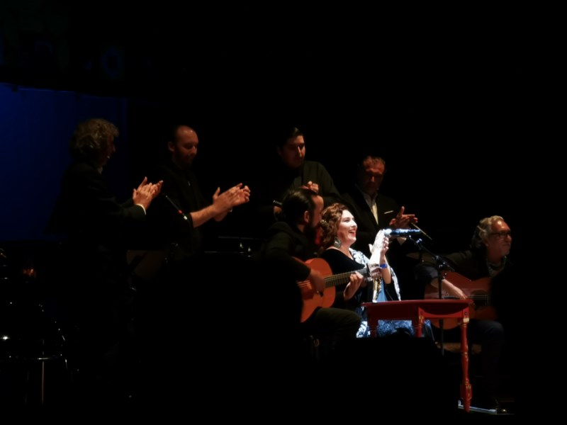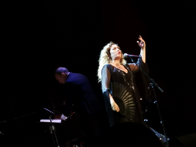 Con la puntualidad granaína de las 9:15, la cantante salió al escenario con vestido de cola y mantilla azul eléctrico. Y abanico en mano demostró lo bien que controla un género donde no basta tener una voz como la suya, si no se acompaña con la teatralidad que llevan implícitas estas canciones sobre amores imposibles, traiciones, nobles toreros…