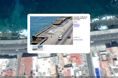 Recientemente AxE News entrevistó a José Ruiz, artista canario participante en la Oncena Bienal de La Habana dentro del proyecto Detrás del muro. Su obra, titulada GO, es una lona de 50 metros cuadrados que desde su concepción pretendía ser visible a través de Google Earth, haciendo referencia, por un lado, a la dificultad (o imposibilidad) de acceso desde Cuba al paquete completo de servicios de la aplicación, y por otro, a que desde otras latitudes se pueda acceder fácilmente a la Isla, recorrer sus ciudades.