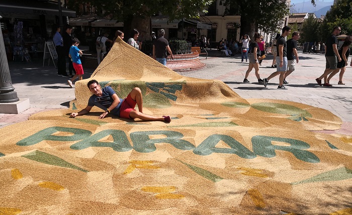 Si hay un producto artesanal típico de Andalucía –y quizás de España toda-, ese es el esparto. Precisamente este material ha sido el escogido por Martín Azúa (Vitoria, 1965) para diseñar la inmensa alfombra que ha convertido la Fuente de las Batallas en el salón de nuestra casa. En ella nos acostamos, corremos, saltamos y hasta paseamos con la bici…