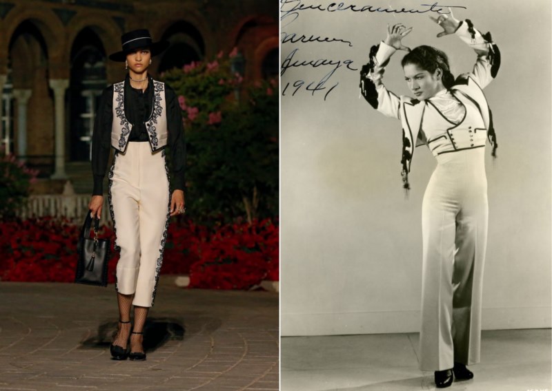 Carmen Amaya, bailaora convertida en leyenda del flamenco, ha tejido con su taconeo muchos de los trajes mostrados en esa pasarela. Su despego de la bata de cola para el uso del pantalón, que mostraba mejor sus movimientos, la ha convertido en un icono de la moda. Nace en Somorrostro, Barcelona, con el agua guiando su baile. Su atrevimiento era tan fuerte como una ola. “Nací a la orilla del mar. Mi vida y mi arte nacieron del mar” dijo en una ocasión.