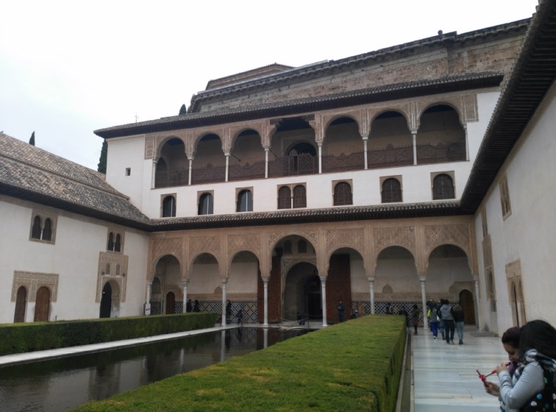 Las dependencias árabes terminan en la Torre de las Damas y en los Jardines y el estanque del Partal, lo único que queda de lo que fuera otro de los palacios, el de Yusuf III (1408-1417). Esta es la imagen más conocida del interior de La Alhambra.