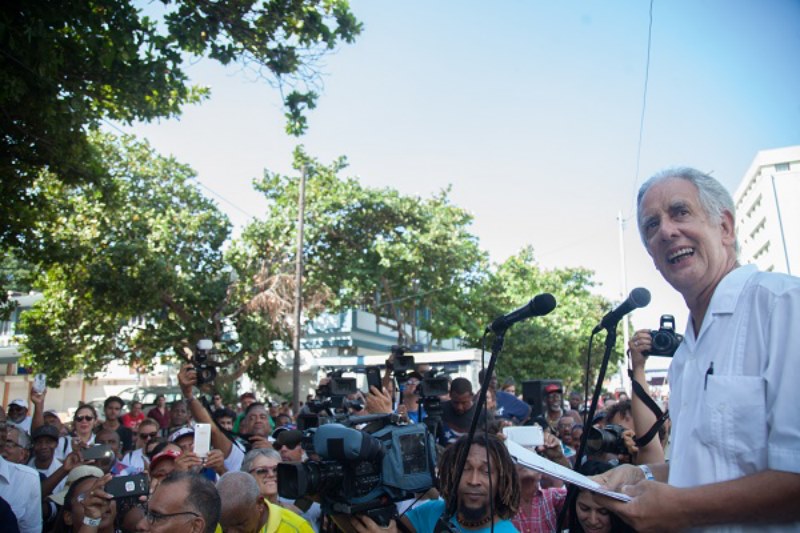 Cubanos… y ese camino recorrido por la orquesta durante estos 50 años, tuvo su origen aquí, en este callejón de 23 y P. Por aquí comenzó a crecer la leyenda. Por eso les pregunto, si en este homenaje a nuestro querido Juan Formell en el 500 Aniversario de La Habana, pudiéramos concebir algo más grande que este monumento de tanto calor de pueblo, al estar ubicado entre una parada de guagua y una casetica de ETECSA, para entonces encontrarnos con el escenario, justamente en el medio. Y encima de este, no vemos a los músicos de aquel histórico día, pero sabemos que todavía están aquí y no solos por cierto… sino juntos con todos aquellos otros que en algún momento fueron parte de la orquesta y ya no nos acompañan físicamente. No los escuchamos, pero sabemos que todavía están aquí, tocando y cantando porque es de esas músicas que gozamos con toda la alegría posible cada vez que hablemos de Juan Formell y Los Van Van… Por eso les decía que la tarja que vamos a develar, no es pequeña sino bien inmensa, enorme como un país… porque así nos lo recuerda la memorable foto tirada por Iván Soca al espacio de una acera santiaguera donde aparece escrito con lechada en el piso una frase, frase anónima que ella sola por sí misma, encierra todo el significado lo que hemos hablado aquí en esta tarde: Los Van Van son la patria.