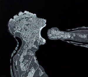 En aquel conjunto que fraguó como La tierra comprometida, los asuntos nacionales tuvieron su centro en Habana, acompañada por Mito y realidad y Nostalgia. Con Habana se fundieron en un cuerpo urbe y bahía. Se les reconocía a ambas su rol en la historia de la nación: significado político, peso económico, distinción en la identidad y la cultura. La bahía fue convertida, tras ser esa brecha tan germinativa, en órgano reproductor femenino, sumando elementos que redondeaban otros conceptos relativos a una urbe hembra, dama seductora, madre. A ella iban los barcos como células sexuales masculinas. Su ronda –al igual que la apretada cuadrícula urbana elegida para representarla– reproducía ese latir metropolitano complejo y sobresaturado del que participamos. En Nostalgia, Cuba transitaba como una banda nubosa sobre la Florida, próxima a Miami –destino de diferentes oleadas migratorias–, distinguiendo esa añoranza (amor/obsesión) de la emigración cubana por la Isla. En otra dirección, Mito y realidad reprodujo los contornos del legendario guerrillero que Korda retratara en 1960, a partir de hoteles de Varadero. Al fundir ese “paraíso” del recreo y el ocio, con la silueta de la fotografía del Che, Tamayo volvía sobre su ideario inculcado a generaciones. Allí, la estatura de ente incorruptible de Guevara, alcanzaba a dialogar con realidades económicas contrarias a su altruismo, desinterés y renunciamiento, luego de una experiencia vivida por el artista en la década del noventa, cuando descubrió su icónica figura convertida en mercancía en los souvenir.