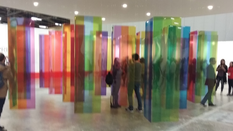 En esta pieza que “ondea” en el aire en ARTBO 2018, integrada por láminas transparentes rojas, amarillas, moradas, azules, verde, naranjas…, vuelve a proponer la fragmentación del plano, utiliza módulos de acontecimientos cromáticos (series de líneas en riguroso orden programado) para evidenciar sus postulados teóricos acerca del color. Ahora, los participantes en la Feria se introducen en ese laberinto propuesto por el maestro, quien ha centrado sus investigaciones en el tiempo, en esa disociación del binomio forma-color, proponiendo liberar el color, de la forma.