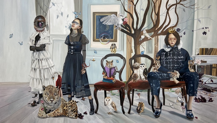 Las composiciones pictóricas de Roberta Lobeira también se sitúan en la frágil línea que separa la realidad y la ficción: espacios cotidianos son invadidos por seres fantásticos, animales, árboles... los personajes parecen de otra época.
