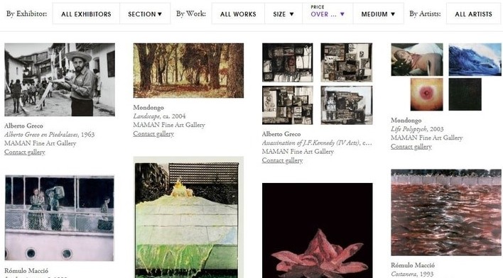 El sitio permite acceder a la feria desde distintas perspectivas. Aquellos que ya tienen una galería a la que siempre visitan, pueden hacerlo, aunque también existe la posibilidad de realizarlo a través de cada artista, los tamaños de las obras o incluso los precios, que se dividen en 5 categorías que van de menos de USS mil a más de 50 mil.