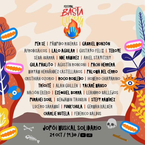 Debido a los incendios que asolan algunos países de Latinoamérica, como Brasil, Paraguay y Argentina, organizamos Jopoi Musical #BASTAQUEMATA, un festival de música virtual donde l@s artistas trabajarán de forma voluntaria, así como especialistas en materia ambientalistas y brigadistas que brindarán testimonios sobre el contexto de las áreas afectadas por los incendios. El festival buscará recaudar recursos económicos para las instituciones que están combatiendo directamente el fuego.