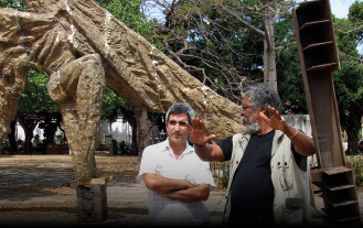 Junto a Alberto Lescay en la instalación y ensamblaje del monumento El pájaro Lam en el parque de 14 y 15, en El Vedado.