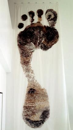 A treasure of our genetic heritage, for her this material is an “object of belonging”, even closer to people than their clothes, which she equally integrates into her works. This proximity to the human remains strong in her drawings of footprints, even when represented as gigantic, they are treated like membranes corresponding to the interior and exterior points of contact with the body.