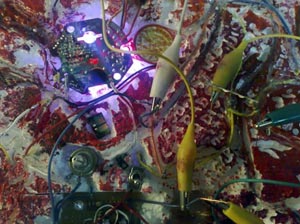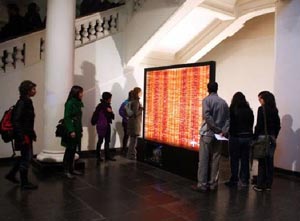e-pintura insane is a sonorous and visual process-work started by Aranda in 2009 with the building of the website http://www.yto.cl/demente/. The viewer can interact with the pieces in the series, by means of buttons and sensors that respond to circuits integrated in the paintings. In addition, viewers were invited to contribute texts, images …. On the other hand, Rx1000 2.0 (Resistance per one thousand, second phase) emerged within the framework of the Ninth Video and Medieval Arts Biennial (Museum of Cotemporary Art, Quinta Normal, University of Chile) and it is a big painting consisting on 1,122 hand-painted pieces. Artium’s exhibition shows the second stage of this project in which the concept of web is developed by using sensors and at least eight people are needed to make the whole work vibrate. Regarding the light paintings, Aranda unveils in this case an unpublished series of works inspired in first-time experiences; in this project she worked jointly with Roberto Larraguibel and NuryGaviola.