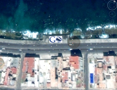 «Es una lona de 50 metros cuadrados, formada por dos piezas de 2,5 metros x 10. Será colocada en uno de los espacios amplios del malecón. La idea era hacer una obra que pudiera visualizarse desde Google Earth, desde el satélite. Y el comentario crítico va en dos sentidos: por un lado se refiere a la dificultad (o imposibilidad) de acceso desde Cuba al paquete completo de servicios de la aplicación, y por otro, a que desde otras latitudes se pueda acceder fácilmente a la Isla, recorrer sus ciudades. Esto conlleva una introspección dentro del espacio público. Digamos que la libertad individual se ve comprometida en tanto a través de Google Earth estamos observados en cada lugar del mundo, lo cual de alguna manera nos condiciona.