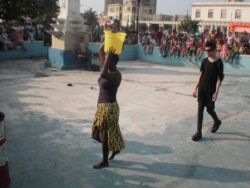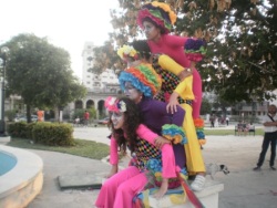 Joëlle Ferly, de Guadalupe, traslada a La Habana el agónico día a día de la mujer tercermundista. Carga cubos y cubos de agua sobre su cabeza de un lado a otro de la fuente seca del parque. El público identifica la metáfora, no tan alejada de algunas zonas de la cotidianidad cubana.