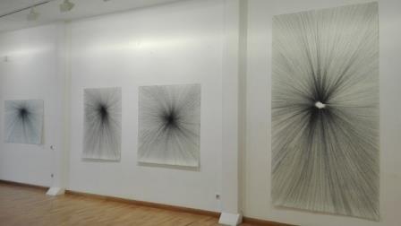 Impacte, el trabajo más reciente, basado en experiencias reales, consiste en trazar líneas desde un punto hasta el extremo del papel. El resultado provocado oscila entre el efecto expansivo de una explosión y la impresión emocional intensa que te cautiva y engulle.