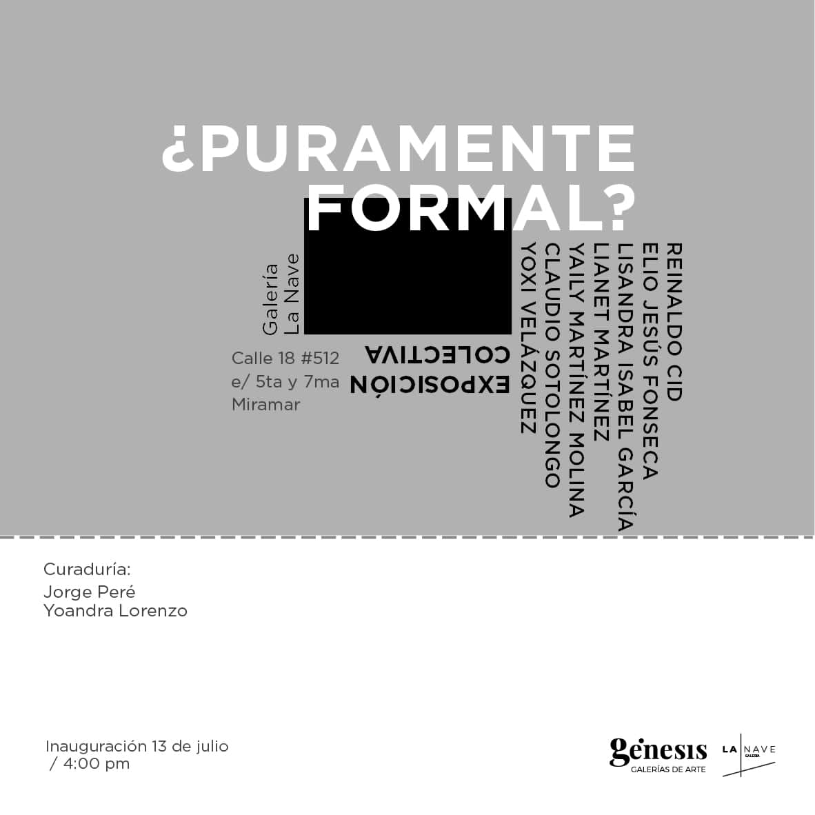 Hasta el próximo mes de agosto estarán abiertas las puertas de la Galería La Nave, de Génesis Galerías de Arte para el disfrute de la muestra colectiva que bajo el título ¿Puramente formal? aúna el trabajo de jóvenes creadores.